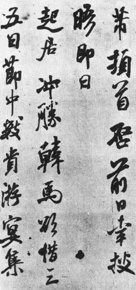 【赏析】: 米芾对线条内部的複杂运动有很好的领悟。这种运动变化以晋人最爲丰富。如王羲之《初月帖》、《频有哀祸帖》等,点画外廓呈複杂的曲线形,这不是用后世的运笔方式所能书写出来的,这种複杂的曲线边廓是由运笔时複杂的使转动作所致。后世执笔、运笔的方式有了改变,再也无法重现这种线条,加上唐代楷书的影响,操运集中于点画端点与折点处,更使“晋人笔法”隐没在历史的迷雾中。米芾早年长期沉浸在古典杰作中,临前人作品可以乱眞,自己的作品被人讥爲“集古字”,但这种深入,使他对传统技巧的理解和把握远远超出同代人的水平。唐代楷书爲宋人带来以提按爲主体的笔法,但米芾自称是“刷字”,即是对提按的一种否定;他说别人只用“两面锋”、他独得“四面”—实际上指笔毫的全部锥面,这正是他通过腕的控制,使笔毫锥体在纸面上自由地滚、抹、扫的生动写照。在用笔中所获得的自由旣带来线条内部操运的丰富变化,又避开了频繁的留驻而使线条的推移流畅奔放。不过米芾在推移中常常加上一些意外的弯折,如首、日、马等字,迁延较长的点画都在不该转换方向时方向有了微妙的改变,并形成折点,在这些折点之间,在所有节点之间,米芾都用他“刷字”的方法加之以较大的张力。这样,线条流畅而不浮滑,变化细腻而又同时给人以“风樯阵马”之感(苏轼语)。 作品单字轴线自由欹侧,但衔接紧密,也许米芾正凭仗这一点而敢于让行轴线随意飘动—它不可能逃离自己的控制。 |