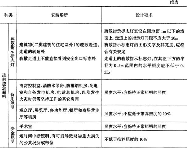 | 释义 | 高层建筑应急照明 (一)应急照明 高层建筑火灾实例证明,造成严重的人员伤亡事故,其原因虽然是多方面的,但与有无应急照明和疏散指示标志有著密切的关系。在火灾时,为了防止触电和通过电气线路和电气设备蔓延扩大火情,需要切断起火部位及所在防火分区的电源。若无应急照明,人们在惊慌之中势必混乱,加上烟气危害,更易引发人员伤亡。 应急照明,是当高层建筑发生火灾及其它灾害、故障时,导致正常照明系统中断而启用的照明,也称事故照明。应急照明包括疏散照明、备用照明、安全照明三部分。 疏散照明,是用以确保安全出口、疏散通道能被有效地辨认和利用,使人们能够安全撤离现场而设置的照明系统。如,疏散走道照明和安全出口照明标志灯等。 备用照明,是当正常照明中断后,用以确保特定场所的工作和活动得以继续进行的照明。如应急发电机房、防灾中心、消防水泵房等场所的照明。 安全照明,是当正常照明中断时,为确保处于潜在危险中的人或物资的安全而设的照明。如医院手术室的应急照明等。 高层建筑应急照明的设置范围如表3-4-21所示。 表3-4-21 高层建筑应急照明设备范围表