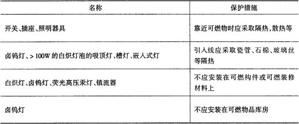 应急照明的配电方式一般供给一路正常工作电源,一路应急电源。两路电源应在末端配电箱内进行自动切换,然后以放射式配出支路到各灯具。配电箱按楼层或防火分区装设,照明支路线不应跨越防火分区,每一单相回路容量不宜超过15A,单相回路连接的灯具出线口数量不宜超过20个(最多不超过25个)。 对于某些建筑物内仅有少量的应急照明设施,且采用灯具内自带蓄电池作为备用电源时,正常电源和备用电源可在灯具内进行切换即可。 正常电源和备用电源其切换时间应视应急照明类别或应用场所确定。一般用于疏散照明和备用照明时不应大于15s,用于安全照明时不应大于0.5s。 采用蓄电池作为应急照明灯的备用电源时,供疏散照明用蓄电池,当建筑物高度<100m时,连续供电时间≥20min。 当建筑物高度>100m时,连续供电时间≥30min。备用照明和安全照明用蓄电池的容量应满足其持续工作所需的时间,或潜在危险的解除时间,集中供电方式的应急照明用蓄电池放电终止时的电压不应低于额定电压的85%。 自带电源型应急灯的电源应使用全封闭免维护的充电电池。电池正常工作的使用寿命、全充放电循环次数、容量应符合有关技术标准规定。 (三)应急照明光源 在高层建筑中,因电气照明线路和设备的安装位置不当,而屡次引发火灾。如某高层建筑,窗帘布搭在白炽灯泡上,经过长时间烤燃起火,好在房间的火灾探测器准确报警,及时扑救,才未酿成重大火灾。因此,对于照明灯具表面的高温部位,应采取隔热、散热等防火保护措施。 火灾实例表明,白炽灯、卤钨灯、荧光高压汞灯和镇流器等发热灯具,若直接安装在可燃构件或可燃装修上,容易引发火灾。由于卤钨灯灯管表面温度可达700~800℃,配线必须使用耐热电线。白炽灯泡的吸顶灯、嵌入式灯的灯罩内或灯泡附近的温度,大大超过一般绝缘导线运行时周围环境的允许温度,若灯头引入线不采取措施,其导线极易损坏,引起短路,酿成火灾。灯具等防火保护措施如表3-4-23所示。 表3-4-23 灯具的保护措施