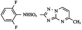 中文通用名称:唑嘧磺草胺,英文通用名称:flumetsulam,其他名称:阔草清、Broadstrike、DE-498,化学名称:N-2,6-二氟苯基-5-甲基-1,2,4三唑(1,5a)嘧啶-2-磺酰脲,化学分子式:C12H9F2N5O2S,相对分子量:255.3。 化学结构式:  理化性质:纯品为白色固体,熔点251~253℃。蒸汽压0.37nPa(25℃)。溶解度:水中49mg/L(pH2.5),溶解度随pH升高而升高,微溶于丙酮(<1.6%)、甲醇(<0.4%),不溶于己烷、二甲苯。 毒性:大鼠急性经口LD50>5000mg/kg,兔急性经皮LD50>2000mg/kg。 农药类别:低毒三唑并嘧啶磺酰胺类除草剂。 |