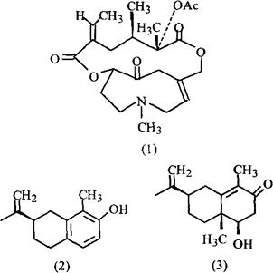 | 释义 | 齿叶橐吾 【名称出处】:《陕西中药名录》 【概况】: 异名 葫芦七(《陕西中草药》),紫菀(陕西)。 基源 为菊科橐吾属植物齿叶橐吾的根或全草。 原植物 齿叶橐吾Ligularia dentata(A.Gray)Hara(Brythrochaetadentata A.Gray) 形态 多年生草本。根肉质、粗壮。茎高30~120cm,上部分枝,被白色蛛丝状柔毛和黄色有节短柔毛。 基生叶及茎下部叶具柄,柄长22~60cm,无翅,被毛,叶片肾形,长7~30cm,宽12~38cm,顶端圆,边缘具整齐的齿,齿间有睫毛,基部弯缺宽,长为叶片的1/3,背面有白色蛛丝状柔毛,掌状脉5~7;茎中、上部叶无柄,叶鞘膨大、叶片渐小。头状花序多数组成伞房状花序,花序梗长达9cm、被毛;苞片及小苞片卵状披针形;总苞半球形,长1.5~2.5cm,宽1.8~3cm,总苞片8~14,2层,紧密,长圆形,顶端具长尖头,背面密被白色蛛丝状柔毛,内层具宽的褐色膜质边缘;舌状花黄色,舌片狭长圆形,长达5cm;管状花多数,长1~1.8cm。 瘦果圆柱形,长7~10mm,有肋;冠毛红褐色。花果期7~10月。 (图见《中国植物志》.第77卷第2分册.15页.图版2∶1-3) 生境与分布 生于海拔650~3200m的山坡林缘、林中或水边。分布于陕西、甘肃、安徽、江西、河南、湖北、湖南、四川、云南和贵州。日本也有分布。 。【生药】: 采集 夏、秋采挖,晒干。 【化学】: 含橐吾定碱Liqularidine(1)[1]。根含去甲倍半萜类化合物:齿叶橐吾酚Ligudentatol(2)、橐吾莎草酮醇Ligucyperonol(3)、石竹烯Caryophillene[2]。