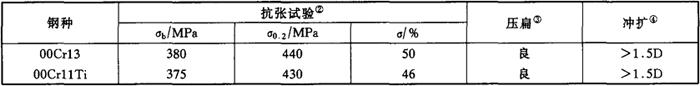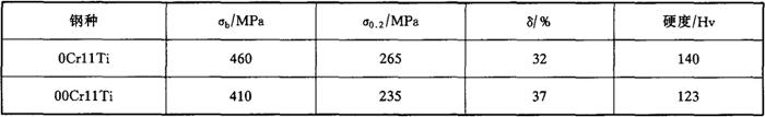 (2)物理性能 密度:ρ:7.75g/cm3; 比热容C:461J/(kg·K); 线膨胀系数α:27~93℃时,10.8×10-6/K; 27~538℃时,11.9×10-6/K;27~982℃时,13.5×10-6/K。 热导率λ:93℃时,24.9W/m·K; 538℃时,28.5W/m·K。 电阻:0.60μΩ·m。 (3)力学性能 0Cr11Ti,00Cr11Ti钢的室温力学性能见表2-2。 表2-2 0Cr11Ti、00Cr11Ti不锈钢的力学性能