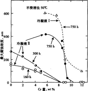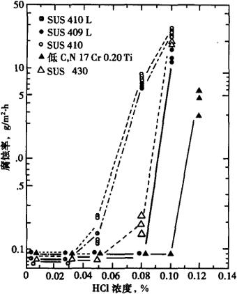 Cr11Ti钢由于含铬低,低碳,氮又加Ti,所以在铁素体不锈钢中强度相对较低,延伸率相对较高。 (4)耐蚀性 0Cr11Ti,00Cr11Ti在比较弱的腐蚀环境中,如大气和淡水中有着优异的耐蚀性。在含微量HCl的沸腾溶液中它们的腐蚀率较0Cr13(410),00Cr13(410L)低,也较0Cr17钢低,有着较宽的耐酸界限,(见图2-1)。在模拟汽车消音器冷凝液的环境下,钢的腐蚀率随Cr量增加而降低,当Cr≥11%,腐蚀率降到非常低(见图2-2)。因此,0Cr11Ti,00Cr11Ti钢已在现代汽车排气系统中代替镀Al钢,得到广泛应用。