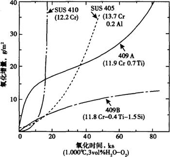 图2-2 消音器模拟冷凝液中Cr钢的耐蚀性冷凝液Ⅰ:含Cl-, (5)抗氧化性 0Cr11Ti,00Cr11Ti铁素体不锈钢有着比软钢更为优异的高温抗氧化性,断续高温使用温度为815℃,连续使用为675℃。Cr11Ti钢,由于含Cr量较低,在900℃大气中100小时连续加热通常会发生氧化,所以此钢在过于苛刻的氧化条件不宜使用。图2-3示出,在含3%水分1000℃氧气氛围中进行氧化试验的结果。0Cr13(410)钢5小时多就发生异常的氧化,氧化增量急剧增加,与之相比含0.2%Al的0Cr12(405)钢初期氧化增量较低,而经过10小时后也加速氧化,图中00Cr11Ti(Cr11.9%,Ti0.7%)材料较0Cr13Al(405),00Cr13(410)抗氧化性好,而加入1.5%Si和加B钢表现出最好的抗氧化性。