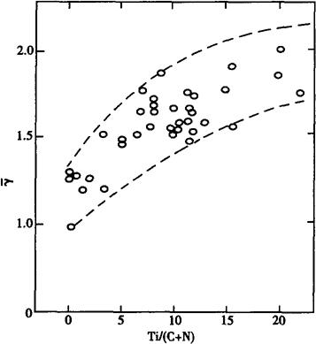 图2-3 各种低Cr铁素体不锈钢的高温氧化特性 (6)冷热加工和热处理 0Cr11Ti,00Cr11Ti钢开始热加工温度为1100~1150℃,卷取温度~600℃,热轧带坯在罩式炉退火830~870℃8小时。 冷轧带在冷线或混线的连续退火酸洗线上处理,热处理控制在860℃±10℃。 (7)成型性 0Cr11Ti、00Cr11Ti铁素体不锈钢的成型性较奥氏体不锈钢和软钢差些,但是在铁素体不锈钢中是最优异的。可进行相当程度的成型加工。评价冲压成型有两大要素,即深拉伸性和胀形性。 a.深拉伸性 深拉伸性与钢板的结构有关。00Cr11Ti,由于低碳,氮又加Ti,钢板平行轧制面{111}较发达,因此γ值较高,深拉伸性较好,图2-4指出Ti含量对低C,NCr13铁素体不锈钢γ值的影响,Ti加入量为(C+N)的10倍以上时γ值最好。