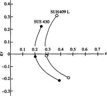 图2-4 Ti对低C、N-Cr13铁素体不锈钢γ值的影响 b.胀形性 胀形性是以延伸率和n值为指标的,它受钢的合金元素的含量和纯度的影响,Cr、C及其他元素含量愈低,纯净度愈高,胀形性愈好。低Cr铁素体不锈钢本质上Cr就低,对延伸率是有利的,因此以Cr11为基,再降低不纯物元素含量并加入微量Ti,必然具有较好的胀形性并兼备极好的深拉伸性。 表2-3示出00Cr13(410L)、00Cr11Ti(409L)成型性试验值,其成型性是良好的,特别是00Cr11Ti,γ值,Eγ值CCV值及扩孔比都好。图2-5给出00Cr11Ti、0Cr17钢板的成形极限,00Cr11Ti比0Cr17大得多。 表2-3 00Cr13,00Cr11Ti铁素体不锈钢的成型性