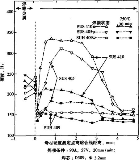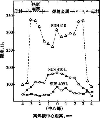图2-5 00Cr11Ti和0Cr17钢成形极限曲线(板厚1.5mm (8)焊接性 0Cr11Ti,00Cr11Ti一般可用各种方法焊接,如钨极氩弧焊,金属极氩弧焊,电阻焊,点焊等。如需填充金属,建议用0Cr11Nb,焊接时输入的热量应该小些,避免晶粒过分长大,以免过分降低焊缝和热影响区的塑性和韧性。0Cr11Ti,00Cr11Ti钢有着较0Cr13Al,00Cr13钢好的焊接性能。图2-6示出0Cr11Ti(409),0Cr3Al(405),0Cr13(410)厚板用0Cr23Ni11(309)型焊条焊接,焊缝附近硬度的分布。0Cr11Ti焊缝附近,HAZ(热影响区)硬度几乎没有变化,没有马氏体生成,仅由于高温下单相铁素体晶粒粗化,所以00Cr11Ti厚板焊接加工时,应尽量减小输入热量,避免晶粒长大引起HAZ破裂。图2-7示出板厚1.5mm焊接,焊缝附近硬度分布,00Cr11Ti(409L)焊缝金属和热影响区是铁素体单相,硬度几乎没有变化,因此,薄板焊缝加工性能优异。图2-8示出00Cr11Ti(409L)汽车排气管高频焊,焊缝附近硬度分布,焊缝中心由于加压变形较周边硬度略有升高。高频焊与电弧焊不同,几乎看不出溶融凝固处。高频焊管性能示于表2-4,有着优异的延伸率和加工性,用作排气管等加工无特殊困难。
