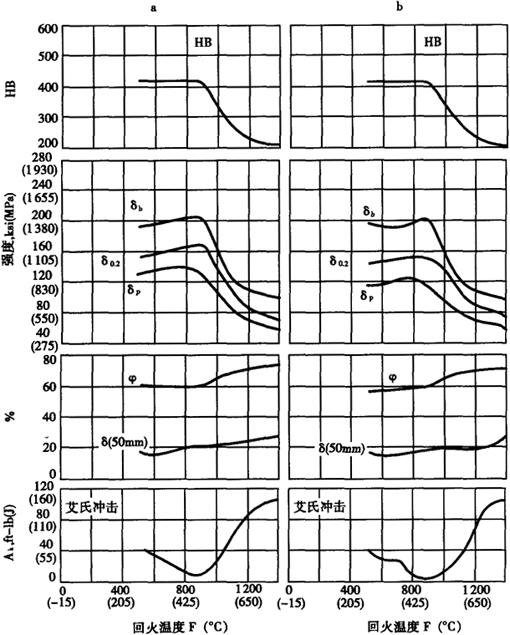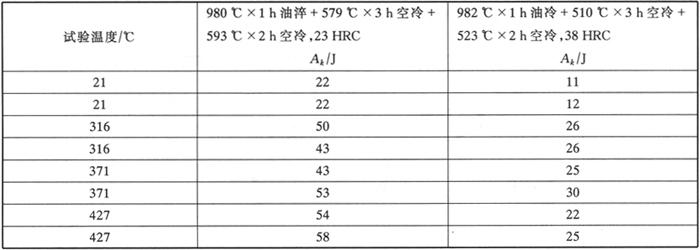 图3-2 奥氏体化温度和回火温度对1Cr13钢室温力学性能的影响(回火时间为2h) a:925℃×30min油冷到65~95℃,175℃×15min消除应力 b:1010℃×30min油冷到65~95℃,175℃×15min消除应力 表3-4 热处理及温度对1Cr13钢夏比V形缺口冲击性能的影响