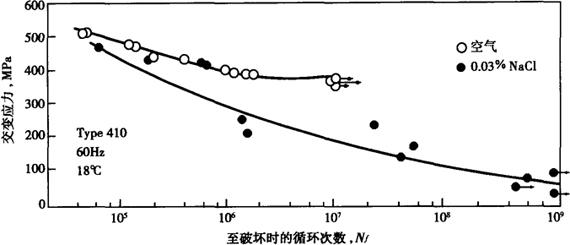 图3-4 1Cr13钢在空气和0.03%NaCl环境中的疲劳行为
