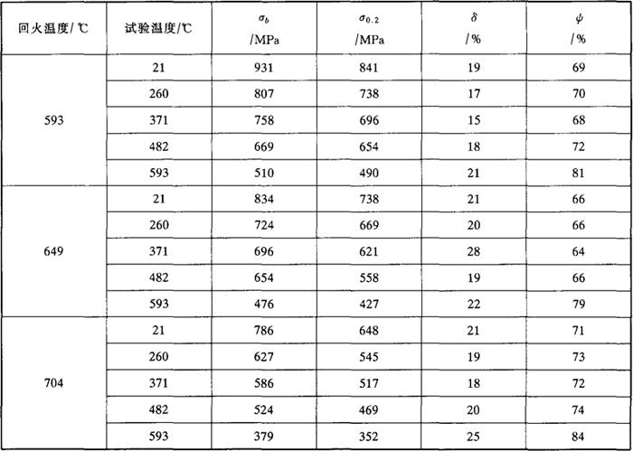 表3-7 回火温度对1Cr13高温瞬时力学性能的影响(1010℃×30min油淬,回火时间4h)