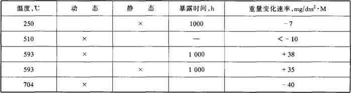 (8)抗氧化和耐蚀性 1Cr13钢出现强烈氧化开始温度为750℃。抗氧化性能见表3-12,1Cr13钢具有不锈性,在室温稀硝酸及弱有机酸中也有一定耐蚀性,在某些介质中的耐蚀性见表3-13。在反应堆环境中的腐蚀见表3-14至表3-17。 表3-12 1Cr13钢抗氧化性