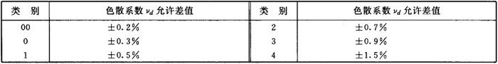 表1-3和表1-4中的4类仅适用于nd大于1.82的玻璃。 2.2.1.2 根据同一批玻璃中,折射率及色散系数的最大差值,玻璃的一致性按表1-5分为4级。 表1-5 玻璃一致性的分级