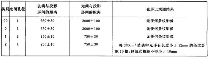 2.2.4 条纹度 条纹是指玻璃内部折射率的局部不均匀,外形如线状条纹,类似于圆柱透镜,引起光线方向的变异,主要是由于光学玻璃熔炼过程中各部分成分不同而引起的。最易引起条纹的玻璃是ZF类,其次为F、BaF、BaK等。 2.2.4.1 玻璃用投影条纹仪从规定方向观测时,条纹度按表1-10分为4类。 表1-10 玻璃条纹度分类(mm)