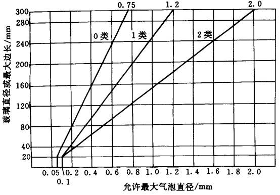 2.2.5 气泡度 玻璃中的气泡相当细微的凹透镜,引起光的散射和折射。最容易引起气泡的玻璃是含有BaO的BaK、BaF和ZK等。 2.2.5.1 玻璃的气泡度类别根据其直径或最大边长及所含最大气泡的直径,按图1-1分为3类。