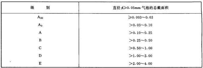 图1-1 气泡度分类图 2.2.5.2 玻璃的气泡度级别根据每100cm3玻璃内允许含有气泡的总截面积(mm2)的大小,按表1-12分为7级(结石、结晶体及其它内含物亦作为气泡计算。扁长气泡取最长轴和最短轴的算术平均值为直径计算截面积)。 表1-12 玻璃气泡度分级(mm2/100cm3)