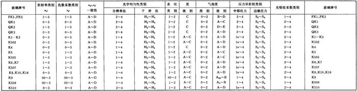 | 释义 | 2.质量指标、类别和级别 2.1 质量指标 玻璃按下列各项质量指标分类和分级: (a)折射率、色散系数与标准数值的允许差值; (b)同一批玻璃中,折射率及色散系数的一致性; (c)光学均匀性; (d)应力双折射; (e)条纹度; (f)气泡度; (g)光吸收系数; (h)耐辐射性能(N系列玻璃)。 2.2 分类分级 2.2.1 折射率、色散系数 2.2.1.1 根据折射率及色散系数与标准数值的允许差值,玻璃按表1-3和表1-4各分为6类。 表1-3 无色光学玻璃nd允许差值