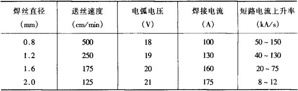 2.焊接电流和电弧电压的选择 CO2焊、焊接电流、电弧电压选择适当,很好配合,才能获得所需要的熔滴过渡形式、稳定的工艺过程和希望的焊缝性能。若焊接电流和电弧电压配合不当,电弧电压过低会造成焊丝插入熔池短路而中断焊接过程。若电弧电压过高则破坏短路过渡或潜弧过渡形式,转为明弧滴状过渡,使飞溅增大、焊接过程不稳。 (1)不同焊丝直径CO2焊常用焊接电流和电弧电压范围见表5-48。 表5-48 不同焊丝直径CO2焊对应的焊接电流和电弧电压