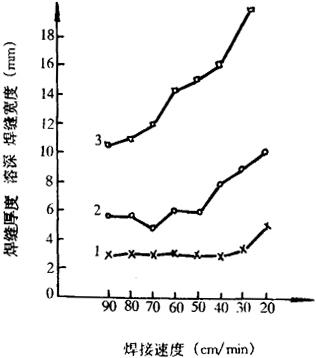 图5-26 焊接电流对焊缝形状的影响 1-焊缝厚度 2-熔深 3-焊缝宽度 (焊丝直径1.6mm、CO2流量20L/min、电弧电压38V、焊接速度70cm/min)