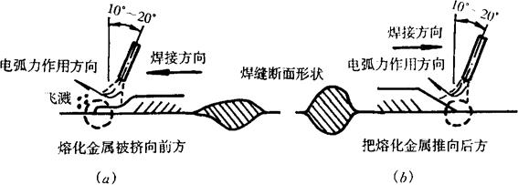 图5-32 平焊时焊枪倾斜角对焊缝成形的影响 |