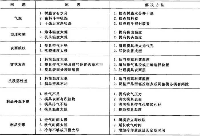 表15-3 生产PC吹塑成型时易发生的问题及解决方法