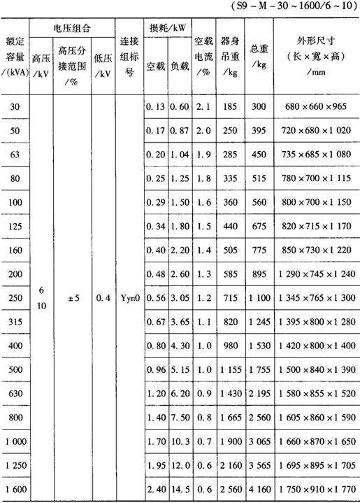 | 释义 | S9系列电力变压器 S9系列电力变压器:10kV级S9系列三相油浸自冷式铜线电力变压器,供交流50Hz的供配电系统中作为分配电能、变换电压之用,可供户内、户外连续使用。 本系列产品的铁芯采用优质冷轧晶粒取向电工钢片,45°全斜接缝无冲孔结构,芯柱铁轭等截面。芯柱采用半干性玻璃粘带绑扎或刷固化漆,使片与片黏合在一起。铁轭用槽钢本身的钢性及旁轭螺栓同时夹紧。 本系列产品的绕组采用高强度的缩醛漆包圆铜线或纸包扁铜线。容量为500kVA及以下者,高低压绕组均为圆筒式。为了提高质量和改进工艺,高低压绕组绕在一起。容量为630kVA及以上者,高压绕组为连续式或半连续式,低压绕组为双半螺旋、双螺旋和四半螺旋式。 本系列产品的油箱结构型式有:长圈形管式油箱,长方形油箱,片式散热器,考虑到生产能力,可用扁管式油箱代替。 本系列产品为无载调压,调压范围±5%。 10kV级S9系列电力变压器技术数据见表4-3。 表4-3 10kV级S9系列电力变压器技术数据