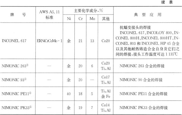 | 释义 | SMC国际超合金集团 SMC国际超合金集团生产的主要焊条焊丝的化学成分及典型应用见表5.7-1、表5.7-2、表5.7-3、表5.7-4、表5.7-5、表5.7-6和表5.7-7。 表5.7-1 SMC国际超合金集团生产的主要镍合金焊条
