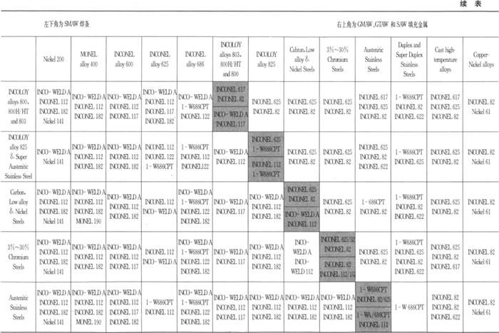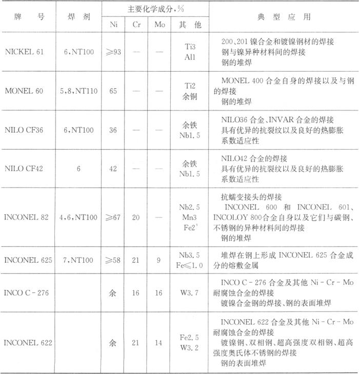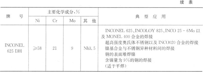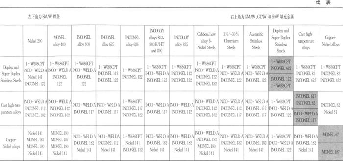 表5.7-7 镍基合金焊接材料推荐表