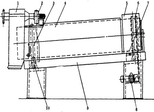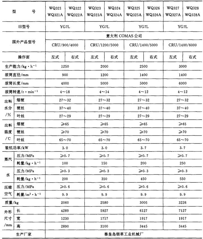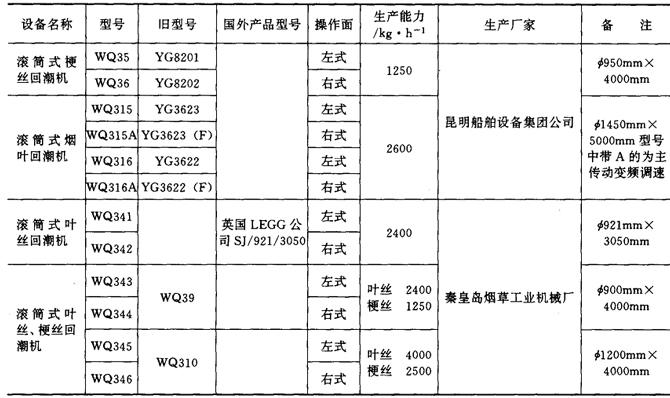 图9-2-6 WQ型滚筒式梗丝、叶丝及烟梗回潮机外形图 1-出料罩 2-排潮风机 3-后滚圈 4-滚筒 5-进料罩 6-前滚圈 7-挡圈 8-传动装置 9-机架 10托轮 4.生产厂家 见表9-2-3。 5.其他型号的滚筒式回潮机 见表9-2-4。 表9-2-4 其他型号的滚筒式回潮机主要参数