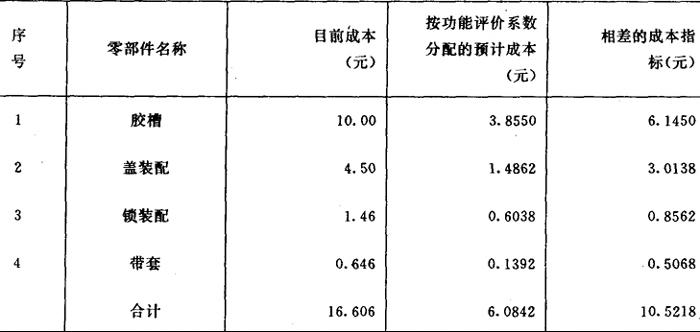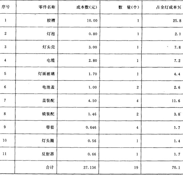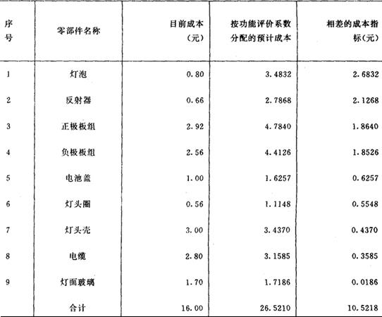 (7)分析第一方案降低成本的目标及预期经济效果: 第一方案中有7个零部件需要从降低成本入手,预计要降低的成本是14.5678元。有6个零部件需要从提高功能入手。预计要增加的成本是3.5620元。如按分析的差价则可低11.006元,因此,重点应先从7个零部件降低成本入手。 以年产50万个矿灯计算,则预计年节约数为: 11.006(元/个)×50(万个/年)=5503000(元/年) 第一方案作为更新产品的方案,在13个主要零部件上预计可以降低成本11.006(元/个)。与Ⅰ型矿灯的主要零部件相比,预计可以降低成本33.8%,重量预计可以减轻28.9~15.6%。 2.第二方案 在原灯基础上改进,从差价表中可以分析出改进目标。见表10。 表10 Ⅰ型矿灯主要零部件用功能评价系数分配的预计成本与目前成本的差价表