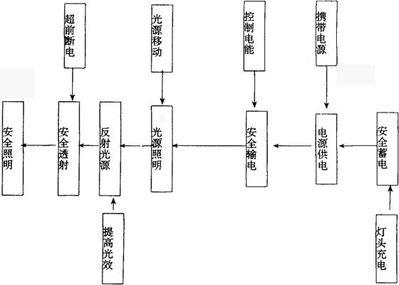 二、Ⅰ型矿灯产品功能的分析及评价 1.Ⅰ型矿灯功能分析 矿灯的基本功能是安全照明。要求具备使用安全,能连续照明,随身携带不碍劳动,并能随眼移动照明等功能。 2.三个部件的功能分析 (1)蓄电池系统的功能分析。 蓄电池要求具有供电及蓄电的功能,也就是具有充放电的功能。蓄电池容器要求具有透气、注液、吸液、不漏液、耐酸、绝缘的功能;要有一定有机械强度和稳定的化学性能;要求具有随身携带的功能,这就要求其重量要轻。 (2)电缆上盖具备电能传输的功能。 (3)灯头要具有光源照明,反射光源,透光照射,安全照明(超前断电),控制电能,电池充电,灯头携带等功能。 3.排列功能系统图 Ⅰ型矿灯功能系统图(见下图):