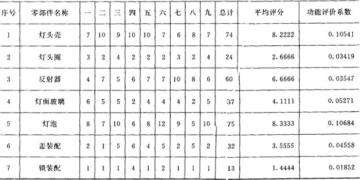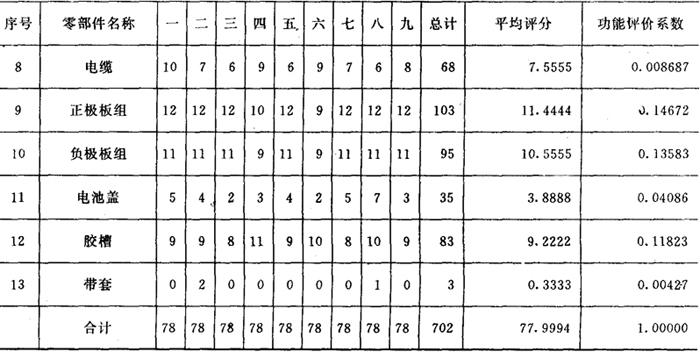4.产品功能评价 该矿灯由125个零件组成。其中47个零件是主要的,已由矿灯成本ABC分析图作了分析。现主要对这47个零件所组成的13个关键零部件作功能评价。由9位工程技术人员参加,评价方法是应用01评分法。将功能评价作为评分评定,各自分别评定,然后再汇总计算平均值。13个主要零部件的评价结果,以功能评价系数来表示。评价表及评价综合统计表分别见表6和表7。现以第三号评价者的评定为例,得出结果,见表7。 表6