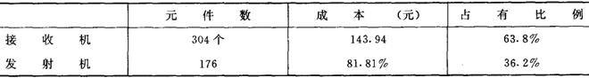 从接收机和发射机所占元器件数量及成本分布中可见,接收机304个元器件,占元器件成本的63.8%,电路复杂程度高,发射机176个元器件,占元器件成本的36.2%(见表3)。 表3