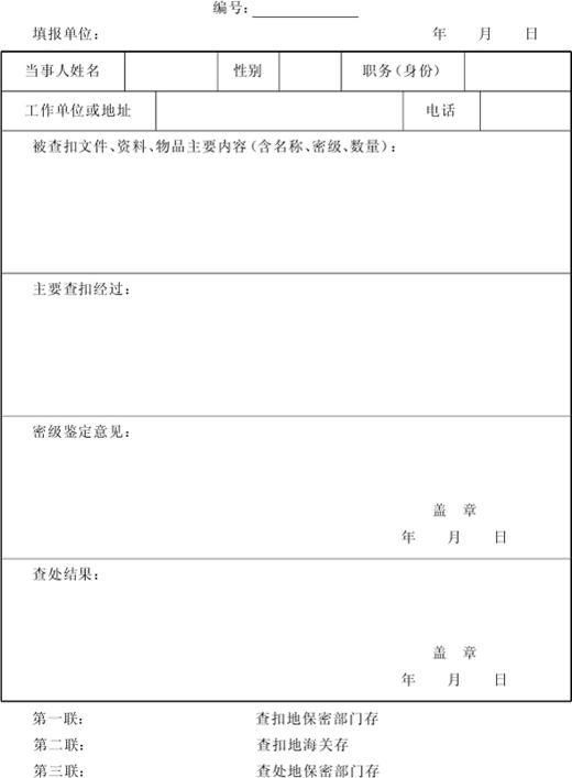 印发《〈关于禁止邮寄或非法携运国家秘密文件、资料和其他物品出境的规定〉的工作办法》的通知 各省、自治区、直辖市保密局,中央和国家机关各部委保密委员会办公室,解放军保密委员会办公室,各人民团体保密委员会办公室,广东分署、各直属海关: 现将《〈关于禁止邮寄或非法携运国家秘密文件、资料和其他物品出境的规定〉的工作办法》印发你们,请认真贯彻执行。 一九九五年三月二十日 《关于禁止邮寄或非法携运国家秘密文件、资料和其他物品出境的规定》的工作办法 第一条 为贯彻执行《关于禁止邮寄或非法携运国家秘密文件、资料和其他物品出境的规定》(以下简称《规定》),制定本工作办法。 第二条 保密工作部门或机构办理《中华人民共和国国家秘密载体出境许可证》(以下简称《许可证》)的管理权限: (一)中央、国家机关和人民团体的保密工作机构负责本部门及在京直属单位办理《许可证》的工作; (二)地市级(含)以上政府保密工作部门负责本行政区域内办理《许可证》的工作; (三)中央、国家机关和人民团体在京外的单位申办《许可证》,可由中央、国家机关和人民团体的保密工作机构负责办理,也可由所在地的地市级(含)以上政府保密工作部门办理。 第三条 负责办理《许可证》的保密工作部门或机构,应按照《规定》第五条和第八条,从严审批。 绝密级国家秘密文件、资料和其他物品不得办理《许可证》。 第四条 对批准携运出境的国家秘密文件、资料和其他物品,有关保密工作部门或机构签发《许可证》时,应做好以下工作: (一)填写《许可证》,字迹要工整、清楚,不得涂改,并按要求逐栏填写,栏尾空白处要加划“—”线,空白栏目应加划“—”符号。 (二)在《许可证》右上方的“( )鉴字”内填写本部门鉴定印章的号码;《许可证》与《许可证存根》中缝要加盖鉴定印章,印迹要清楚,位置要准确。 (三)携运出境的国家秘密文件、资料和其他物品应予包装并铅封(特大物品或不便包装的,可要求携运人进行包装,由《许可证》签发部门当场予以铅封),《许可证》用签发部门的公用信封封装,在信封上写明出境地海关名称,由携运人连同铅封的文件、资料和其他物品一并交出境地海关查验。 (四)携运出境的国家秘密文件、资料和其他物品,如需再带回境内的,办证时应同时为其开具入境证明信,以便海关识别。 第五条 使用鉴定印章、铅识章须经保密工作部门或机构的领导批准。鉴定印章、铅识章应由专人保管,如有丢失、损坏或有机构及其他变动,应立即向国家保密局报告。 第六条 海关按照《规定》第六条,对批准携运出境的国家秘密文件、资料和其他物品,凭加盖鉴定印章的《许可证》和与鉴定印章号码一致的铅识章号码验放。《许可证》由海关收存,并于次年一月十五日前,通过当地政府保密工作部门,逐级上交国家保密局。 第七条 对邮寄或非法携运国家秘密文件、资料和其他物品出境的当事人,海关可根据有关规定视情处以罚款;对情节严重,构成犯罪的,依法移送有关司法机关处理。 第八条 海关根据《规定》第九条和第十条,对查扣的国家秘密或涉嫌涉密的文件、资料和其他物品,应及时填写由国家保密局统一制发的《海关查扣邮寄或非法携运国家秘密文件、资料和其他物品移交登记表》(以下简称《登记表》)一式两联(见附件一),并通知所在地的地市级(含)以上政府保密工作部门,由该保密工作部门接收《登记表》及查扣件。 第九条 查扣地的地市级(含)以上政府保密工作部门接到海关移交的《登记表》及查扣件后,应将本部门的处理意见填写在《登记表》“保密部门处理意见”一栏内,并将第一联退查扣海关留存。同时填写由国家保密局统一制发的《查扣邮寄或非法携运国家秘密文件、资料和其他物品移送鉴定、查处通知单》(以下简称《鉴定、查处通知单》)一式三联(见附件二),并连同查扣件一起,按下列情况移送有关部门鉴定、查处: 1.对有密级标志的国家秘密文件、资料和其他物品,直接移送被查扣人所在地的地市级(含)以上政府保密工作部门,由该保密工作部门负责进行查处;如被查扣人属于中央、国家机关和人民团体的,直接移送其所在的中央、国家机关和人民团体的保密工作机构进行查处。 2.对需要进行鉴定的文件、资料和其他物品,直接移送被查扣人所在的省、自治区、直辖市的保密工作部门,由该保密工作部门按照“国家秘密及其密级具体范围的规定”进行鉴定,如需要有关中央、国家机关和人民团体鉴定的,该保密工作部门应移送有关中央、国家机关和人民团体的保密工作机构进行鉴定;如被查扣人属于中央、国家机关和人民团体的,应移送其所在的中央、国家机关和人民团体的保密工作机构进行鉴定。 3.被查扣人属于境外的,应根据其提供的情况,按本条上述办法移送鉴定、查处。 第十条 接到《鉴定、查处通知单》的有关保密工作部门或机构,应积极组织鉴定或查处工作; 对海关查扣的有密级标志和经鉴定属于国家秘密的文件、资料和其他物品,应依据有关保密法规进行查处; 对鉴定为不属于国家秘密的,应由鉴定部门在《鉴定、查处通知单》上写明鉴定意见,由被查扣人所在地的地市级(含)以上政府保密工作部门根据鉴定意见,出具非密证明,同时通知物主前来领取;被查扣人属于中