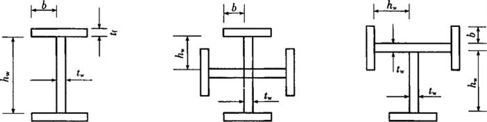 图12-10 钢骨混凝土结构梁柱节点示意图 (二)钢骨混凝土构件钢骨含钢率 钢骨含钢率是指截面中钢骨面积占混凝土全截面面积的百分比。控制钢骨含钢率的上限和下限,是为了保证构件具有钢骨混凝土的特性和便于混凝土浇筑施工。如果钢骨含钢率过大,也会降低混凝土与钢骨的共同工作性能。钢骨含钢率的取值范围,我国《钢骨混凝土结构设计规程》中规定:钢骨混凝土梁柱中钢骨的含钢率不小于2%,也不宜大于15%。在一般情况下,较为合理的含钢率为5%~8%。 (三)钢骨混凝土构件中钢骨板块的宽厚比 在钢骨混凝土构件中,钢骨的翼缘和腹板都受到外包混凝土的约束。《钢骨混凝土结构设计规程》中对钢骨翼缘宽厚比的限值是纯钢构件规定值的1.5倍左右;对钢骨腹板宽厚比的限制值是纯钢构件限制值的2.0倍左右。《钢骨混凝土结构设计规程》中还规定,钢骨混凝土构件中,钢骨板材(图12-11)的厚度不小于6mm,宽厚比不应大于表12-5中的限制值。