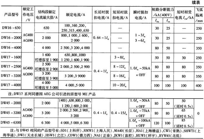 | 释义 | 万能式断路器 1.适用范围 万能式断路器适用于交流50Hz,额定工作电流至6300A,额定工作电压至690V的配电中,用来防止电能分配和电源设备的过载、欠电压、短路、单相接地等故障的危害以及保护线路。DW40、DW45、DW450等断路器具有智能化、选择性保护功能,能提高供电可靠性,避免不必要的停电。 2.常用万能式断路器的结构特征 (1)DW15-630型断路器分固定式和抽屉式两种,抽屉式由断路器本体及抽屉座组成。断路器为立体布置形式,触头系统、瞬时过电流脱扣器和左右侧板安装在一块绝缘板上。上部装有灭弧系统,操作机构可装在正前方或右侧面,有“分”、“合”指示及手动断开按钮机构指示。左上方装有分励脱扣器,背部装有欠电压脱扣器与脱扣半轴相连,速饱和电流互感器或电流电压变换器穿在下母线上,欠电压延时阻容装置、热继电器或电子型脱扣器均分别装在断路器下方。 (2)DW15-1000~4000型断路器也采用立体布置形式,由底架、侧板、横梁组成框架,每相触头系统安装在底架上,上面装灭弧室。操作机构在断路器右前方,通过主轴与触头系统相连。电动操作机构通过方轴与机构成一体装于断路器下部,作为断路器的储能或直接闭合之用,储能后的闭合由释能电磁铁承担。在左侧板上方装有防回跳机构,以防止断路器在断开时弹跳。各种过电流脱扣器按不同要求装在断路器下方,欠电压、分励脱扣器及电动操作控制部分装在左侧,其中欠电压、分励脱扣器通过脱扣器与放大机构相连,以减少断路器脱扣力。6对辅助触头供用户连接二次回路用,面板上有显示断路器工作位置的指示牌“I”、“O”和“储能”指示,还有供合闸及分闸用的按钮“I”、“O”(均按下)。DW15-1600断路器附有手动操作手柄;DW15-2500、4000断路器附有检修的手动操作手柄(均可卸下)。 (3)DW15HH断路器是DW15的二次开发产品,分固定式和抽屉式两种结构;断路器为立体布置,由侧板、横梁组成框架,每相触头系统安装在框架上,上面装灭弧室。操作机构在断路器右前方,通过主轴与触头系统相连。电动操作机构通过方轴与机构连成一体装于断路器下部,作为断路器的储能或直接闭合之用,储能后闭合由释能电磁铁完成。在左侧板上方装有防回跳机构,以防止断路器在分断时弹跳。欠电压和分励脱扣器经过放大机构与脱扣半轴相连,以减少断路器的脱扣力。面板上有显示断路器工作位置的指示牌“I”“O”及智能控制器,手动操作手柄供手动储能使用(仅指2000壳架)。抽屉式断路器由断路器本体与抽屉座组成,通过断路器本体上的母线与抽屉座上桥型触头的插座接通主回路,具有机械联锁装置,能保证断路器在断开状态下进行主回路转换。控制器由互感器组件、电子部件及执行元件等三部分组成,互感器组件由空心互感器和速饱和互感器组成,直接套在母线上,二次引出线与控制器相连。 (4)DW16万能式断路器主要由自由脱扣机构、触头系统、过电流脱扣器、灭弧系统等组成,触头系统、过电流脱扣器均装在断路器的底板上,触头系统的上面装灭弧系统,右侧装有自由脱扣机构通过主轴与触头系统相连,左侧装辅助开关。触头材料采用特种合金,有良好的抗熔焊性和低接触电阻。灭弧室栅片为平行布置,灭弧壁采用耐弧塑料制成,并配置隔弧板从而提高了断路器短路分断能力。断路器还可根据需要安装电动机、杠杆、电磁铁(只适用于630A以下壳架等级电流)等操作机构。 (5)DW17断路器是采用立体式的积木结构,分为三个壳架电流等级,即630~1605A一个壳架等级;2000~2505A一个壳架等级,3200~3205A一个壳架等级。三个壳架电流等级以630~1605A壳架为基础,其他壳架则根据不同的额定电流采用积木式结构拼装而成。断路器由框架、触头系统、灭弧系统、脱扣器、操作机构、抽屉座、触刀座及二次接线回路组成。总体结构分固定式和抽屉式两种,抽屉式附有加长导轨以利于用户的维修。接线方式有垂直进出线、水平进出线,操作方式有手动操作、电动操作和预储能操作。断路器的过电流脱扣器由瞬时脱扣器、长延时脱扣器和短延时脱扣器组成。用户可根据使用要求进行组合,实现一段、二段或三段保护。 (6)DW45智能型万能式断路器分固定式和抽屉式二种结构。其中固定式断路器主要由触头系统、智能脱扣器、手动操作机构、电动操作机构和安装板组成;抽屉式断路器主要由触头系统、智能脱扣器、手动操作机构、电动操作机构和抽屉座组成。智能型万能式断路器具有结构紧凑、体积小的特点。触头系统封闭在绝缘底板内,其每相触头也都用绝缘板隔开,形成一个个小室,而智能型脱扣器、手动操作机构、电动操作机构依次排在其前面而形成各自独立单元,如其中一个单元坏了,可将其整个拆下换上新的。其中: ①触头系统:由于采用一档触头,省去了弧触头(如有弧触头)的转移过程,减少了触头的操作力,加快了短路电流分断的过程。为了降低触头之间的电动斥力,提高触头系统的电动稳定性,触头系统采用多路并联。触头,软连接及母排之间均采用焊接,减少了接触电阻,降低了功耗。 ②灭弧室:灭弧室壁用绝缘材料压制而成,灭弧室中除装有灭弧栅外,还装有灭焰栅,使电弧向上吹入灭弧室。 ③基座:触头和灭弧系统均位于上下基座之间的空间之中。上下基座均由高强度、电气性能优良的绝缘材料压制而成。每相