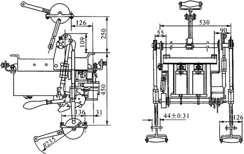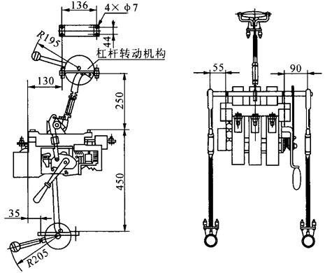 图1-24 DW16-2000直接手动操作及电动机操作外形及安装尺寸 ④DW16-2000杠杆操作外形及安装尺寸见图1-25。