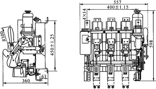图1-25 DW16-2000杠杆操作外形及安装尺寸 ⑤DW16-4000外形及安装尺寸见图1-26。