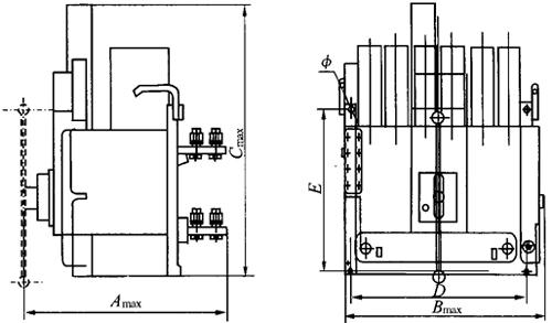 (1)M系列为法国施耐德公司产品,外形与安装尺寸基本与DW45相似,施耐德公司新推出的MT系列也分三个框架,分别为1600,4000和6300,与M系列相比,额定运行短路分断能力与额定短时耐受电流进一步提高,实现Icu=Ics=Icw;产品外形尺寸缩小,保护功能齐全;智能控制器在原保护功能基础上,增加电压、频率和功率的测量,谐波和基波的计算,精确分析电网质量,能与多种现场总线连接等。 (2)F系列为意大利ABB公司生产的产品,ABB公司新推出的EmaxE系列为5个框架尺寸13个规格,与原F系列相比,额定运行短路分断能力与额定短时耐受电流进一步提高,实现Icu=Ics=Icw;使用3种微处理器脱扣器。具有选择性、后备保护及方向性、接地故障、变压器、线路、发电机、异步电动机、电容器等多种完善的保护特性及功能。可使用Lon Works和Modbus总线进行双向通信联络。 (3)3WN6为德国西门子公司产品,取代原3WN5系列,有3极和4极,固定式和抽屉式二种,最大额定电流3200A,3WN6断路器的过电流脱扣器可用作时间分段控制,并且具有状态显示和故障原因显示。脱扣信号独立存储而不需外部电源,信号的查询也不需附加的信号装置。对于脱扣器机电参数配置的测试也包含在脱扣器中。根据用户需要,还可以提供报警功能,电流表甚至通讯模块。 西门子公司新推出的WL1~WL3系列,与公司原WN6系列相比,从2个框架增加为3个框架,智能控制器功能与测量精度均有明显提高;电流、电压测量精度从原来±3%提高±1%;功率测量精度从原来±10%提高到±3%;通信功能可以与多种现场总路线连接,配置了内部总线,区域联锁模块等。 (4)AT系列是日本寺崎公司推出的新一代产品,与原AH(北开型号DW914)系列相比,该系列产品的保护器由8位微处理控制,有检测电流有效值的电子过电流继电器(OCR),而OCR可以分成三大类:普通配电线路保护、极端反时限特性保护和发电机保护,可实现遥控通信和遥测。 (5)AE-SS为日本三菱公司90年代推出的产品,是在原AE-S(广州南洋型号DW18)基础上的二次开发,与AE-S相比,体积平均缩小30%,采用电子脱扣器,可实现智能型保护,还具有监视、显示、预报、自诊断等功能。 (6)Spectronic系列是美国GE公司推出的新一代产品,有选择型S和限流型L二种,产品保护方式为智能化通信接口,可实现遥控通信和遥测等功能。 4.常用万能式断路器外形及安装尺寸 (1)DW15系列万能式断路器外形及安装尺寸见图1-21和表1-45。