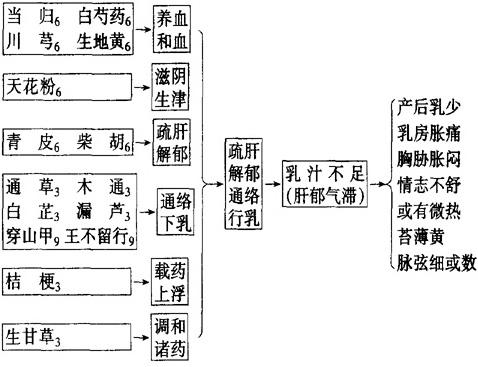 【要点】 本方重用疏通之品,故于缺乳由于脉络郁结不通者宜,于乳汁化生不足者非宜。 【应用】 产后缺乳。 【注意】 本方为产后情志内伤,肝气不舒,乳少而乳房胀满疼痛所设,胀甚者宜加丝瓜络、路路通以助通经活络之效。如乳房焮肿微热者,酌加蒲公英、全瓜蒌、夏枯草清热散结。 【类方】 通乳丹(《傅青主女科》):由人参、生黄芪、当归、麦门冬、木通(或通草)、桔梗组成,用猪蹄煮汤或煮肉汤煎药。功能补气养血通乳。主治产后乳少,乳汁清稀,乳房柔软无胀感,面色少华,神疲食少,舌淡少苔,脉虚细。 |