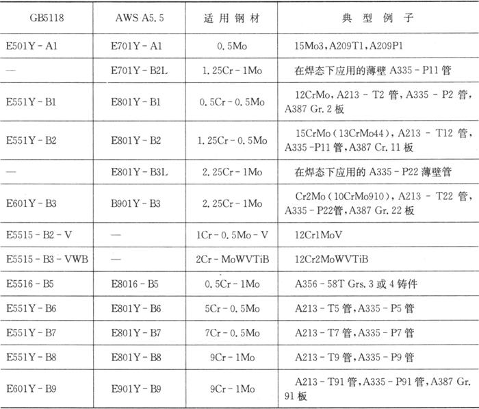 | 释义 | 不同型号(类别)低合金钢焊条的选用说明 碳钢材料在选用焊材时主要是采用“等强”原则,而低合金钢则完全不同于碳钢,其选择焊材首先考虑的是化学成分是否相匹配。即希望焊缝金属尽可能紧密地与母材的化学成分相一致。在AWS A5.5-1996和GB/T 5118-1995标准中,已详细提供了各种类别焊条的焊缝金属化学成分要求及焊态或焊后热处理后焊缝金属的力学性能要求。下面我们将介绍一些典型焊条的应用场合。 1.E70(50)××-A1(C-Mo钢)焊条 该类焊条与碳钢焊条相类似,不同的是加入了0.5%的钼。加钼提高了焊缝金属的强度,特别是高温下的强度,并使抗腐蚀性能也有所提高。但是,它可能降低焊缝金属的缺口韧性。此类焊条适用于C-0.5%Mo钢。 2.E×01×-BX和E×01×-B×L(Cr-Mo钢)焊条 该类低氢焊条熔敷的焊缝金属含有0.5%~9%的铬和0.5%~1%的钼。这些焊条可适用于各类高温下工作的Cr-Mo钢。E×01×-B×L中的“L”表示低碳焊条,常规Cr-Mo焊条的焊缝金属中含有约0.08%的碳,而“L级”则限制碳不大于0.05%,焊缝金属中较低的碳会改善韧性和降低硬度,同时它也会降低焊缝金属的高温强度和抗蠕变性能。 由于所有的Cr-Mo钢焊条在焊接时有不同程度的淬硬倾向,所以要求焊前预热和焊后热处理。这些Cr-Mo钢焊条适用的钢材见表2.2-12。 表2.2-12 Cr-Mo钢焊条适用的钢材