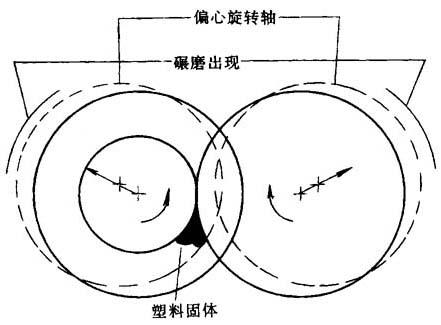 图3-11 反向旋转双螺杆挤出机棱面塑料固体碾磨 双螺杆挤出机重要特性之一是混合机理确保所有塑料有相同的剪切历史。 锥型相互啮合同向旋转的双螺杆挤出机有深啮合的TE型机和浅啮合型的TEM型机。TE型机螺杆的啮合深度约为螺杆外径的20%;TEM型机螺杆的啮合深度约为螺杆外径的10%。 在选择挤出机时,螺杆方面的主要参数有:旋转方向(即同向还是异向)、螺杆的公称直径、双螺杆中心距、螺杆长径比、螺杆最高转速等参数。 |