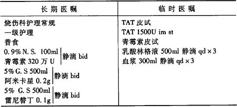 说明:此例为60kg体重,烧伤面积30%,浅Ⅱ度,输液量根据输液公式计算所得。即伤后第一个24小时,每1%烧伤面积每千克体重应补液1.5ml(小儿2.0ml),其中胶体和晶体液的比例为0.5∶1,另加5%葡萄糖2000ml(小儿按体重计算)补充水分。 |