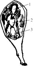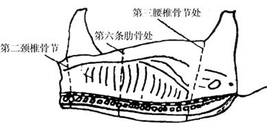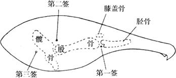 图2-10-5 火腿三签部位 鉴别火腿是否腌好或不同部分是否腌透,以手指按压肉面,若按压时有充实坚硬的感觉,说明已腌透,否则虽表面发硬而内部空虚发软,表明尚未腌透,肉面应保存盐层。第四次上盐后堆叠的层数应视气温不同可适当增加,加大压力以增加食盐的渗透。 c.第五、第六次上盐:这两次上盐间隔时间为7d左右,这次敷盐主要视火腿的大小或厚薄不同,肉面敷盐的面积更为明显地集中在三签地方,露出肌肉面积更大些。火腿已大部分腌透,主要在脊椎骨下部的骨肉尚未完全腌透,仍然很松软,应上少许盐。此时火腿的颜色转变成较鲜艳的红色。经过第六次上盐后,腌制时间已近30d,小腿已可挂出洗晒,大腿则进行第七次腌制。 鉴于以上上盐方法,可以总结口诀为:“头盐上滚盐,大盐雪花盐,三盐靠骨头,四盐守签头,五盐六盐保签头”。用盐间隔天数,除上大盐务必按规定为首次用盐的次日外,其它各次应灵活掌握,而不应强求统一。 火腿腌制过程应注意以下几个问题:鲜腿腌制应按先后顺序排列堆叠,标明日期、只数,不准乱堆乱放;4kg以下的小腿应当单独腌制堆叠,避免与大、中火腿混堆,以便控制盐量,保证质量;如果温度变化较大,要及时翻堆,更换食盐;腌制时要抹盐均匀,腿皮切忌用盐,以防腿皮无光;翻堆时要轻拿轻放,堆叠整齐,防止脱盐。 ④洗晒和整形:腌好的火腿要经过浸泡、洗刷、挂晒、印商标、校形等过程。 a.洗晒:鲜腿经腌制后,通过清洗可除去腿面上的污物,便于整形和打皮印,也能使肉中盐分散失一部分,使咸淡适度,有利于酶在正常情况下发生作用。 洗腿前首先应浸泡,将腌好的火腿放入清水池中浸泡一定时间,浸泡的时间视火腿的大小和咸淡而定,如气温在10℃左右,约浸泡10h,浸泡时肉面向下,全部浸没。 浸泡后即可洗刷,将火腿皮面朝上,肉面朝下捏好,然后按顺序,先洗腿爪,依次为皮面、肉面到腿下部,将盐污和油垢洗净,使肌肉表面露出红色。经过初次洗刷的腿,可在水中再浸泡3h,再进行第二次洗刷。 浸泡洗刷完毕,每两只火腿用绳结在一起,挂在晾腿架上晾晒,约经4h,待肉面无水微干后,进行打印商标,再经3~4h,腿皮微干肉面尚软时开始整形。 b.整形:所谓整形就是在晾晒过程中将火腿逐渐校成一定形状。将小腿骨校直,脚爪弯曲,皮面压平,腿心丰满,使火腿外形美观,而且使肌肉经排压后更加紧缩,有利于贮藏时发酵。整形分三步:在火腿部(即腿身),用两手从腿的两侧向腿心挤压,使腿心饱满,成橄榄形;在小腿部,先用木棰敲打膝部,再将小腿插入校骨凳圆孔中,轻轻攀折,使小腿正直,至膝踝部无皱纹为止;在腿爪部,将脚爪加工成镰刀形,整形后继续曝晒,在腿没变硬前接连整形2~3次(每天一次)。腿形固定后,腿重为鲜腿重的85%~90%,腿皮呈黄色或淡黄色,皮下脂肪洁白,肌肉呈紫红色,腿面各处平整,内外坚实,表现油润时可停止曝晒。 ⑤发酵:发酵的作用是使火腿达到成熟,因为经腌制后还没有达到特有的芳香气味,还必须经过一定时间的发酵,使肉发生变化,才能具有独特芳香气味。 发酵时间与温度有很大关系,一般温度越高则所需时间越短。一般时间较长,从阴历3月至8月份完成。在发酵过程中,火腿表面会长出霉菌,过去认为绿色霉菌是有益霉菌,经过发酵使蛋白质、脂肪发酵逐渐分解形成特殊的芳香味,这一变化过程是极为复杂的,代谢物质是十分丰富的。现在认为,霉菌生长只反映了温度、湿度条件及卫生条件,与腌肉的成熟无关,肉的成熟主要是肉中自身所具有的酶起的作用,其真正变化机理的研究还不够充分。 火腿经过5个月左右的发酵期,就可以从火腿架上取下来,进行堆叠,堆高不超过15层,采用肉面向上、皮面向下逐层堆放,并根据气温不同每隔10d左右倒堆一次,在每次倒堆的同时将流出的油脂涂抹在肉面上,这样不仅可防止火腿的过分干燥,而且经常保持肉面油润有光泽。 (3)产品贮藏 火腿可经长期贮藏,一般一年左右气味还可以保持纯正(往往也有哈味),最好不超过一年,贮藏火腿的堆码方法常用堆叠法,约10d翻倒一次,翻倒时要用油脂擦涂火腿肉面,这样不仅保持肉面油润有光泽,同时可防止火腿的过分干缩和损耗;贮藏时还要注意防火、防鼠;以往的贮藏基本上利用天然条件,现正在加强采取冷藏设备、使用真空软包装材料和保鲜剂及微波技术等措施,这样将会大大延长火腿的货架寿命。 (4)产品质量 火腿的质量主要从颜色、气味、咸度、肌肉丰满程度、重量、外形等方面来衡量。从火腿的颜色可以鉴别出加工季节的含盐量。不同季节加工的火腿品质有很大差异,保藏时间也不同。冬季加工的品质最佳,早冬和春季则次之。 气味是鉴别火腿品质的主要指标,通常以竹签插入火腿的三个肉厚部位的关节处,嗅其香气程度来确定火腿的品级。 金华火腿三签部位如图2-10-5。打签后随手封闭签孔,以免深部污染,打签时如发现某处腐败,应立即换签。用过的签应用碱水煮沸消毒。 (5)产品开发 在我国,肉制品发酵剂的研究是近几年的事,属于一个新兴的研究领域。尤其金华火腿生产中微生物发酵作用更加必不可少。金华火腿属于多种微生物发酵肉制品。在发酵过程中,微生物的作用主要是:形成独特的外观,并通过分泌的蛋白酶、脂酶的作用产生特殊的风味;其中的霉菌是好氧菌,可在生长中消耗O2,抑制其它好氧腐败菌的生长。 金华火腿发酵中涉及的微生物并