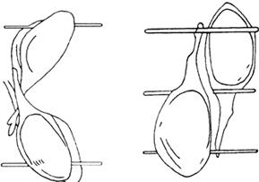 图2-10-2 鲜猪腿的修整 ③腌制:修腿后即可用食盐和硝石(硝酸盐)进行腌制,腌制是加工火腿的主要工艺过程。根据不同气温适当地控制时间、加盐的数量、翻倒的次数,是加工火腿的技术关键。 腌制火腿的气温对火腿的质量有直接的影响,根据金华地区的气候,11月至次年2月间是加工火腿的最适宜的季节。温度通常在3~8℃,腌制的肉温在4~5℃。 在一般正常气温条件下,金华火腿腌制过程中敷盐与倒堆七次,主要是前三次敷盐,其余四次根据火腿的大小、气温条件及不同部位控制腿上的盐量,每次上盐同时翻倒一次。每次上盐的数量和间隔的时间不同,视当时的气温而定,根据金华火腿厂历年的经验数据,用量为鲜腿重的8%~10%。当气温升高时用盐量增加,若腌房的平均温度在15~18℃时,用盐量可增加到12%以上。因为随着温度的升高,敷在鲜腿表面上的食盐溶化速度加快,流失增多,所以应适当增加盐量;反之,温度降低,食盐溶化得慢,流失得少,溶化后的食盐几乎全部渗透到肌肉内部。此外,腌制时的气温不仅决定加盐量,而且也影响腌制时间,即当温度高时堆叠腌制的时间应适当缩短,否则因食盐渗透过快,加工后的产品含盐量高。腌制时间还受腿的大小、脂肪层的厚薄等影响。如6~10kg的鲜腿,腌制时间为40d左右。 a.第一次上盐(出血水盐):将腿肉面敷一薄层盐,占总用盐量的15%~20%,并在敷盐之际在腰椎骨节、耻骨节以及肌肉厚处敷少许硝酸钠,然后以肉面朝上重复依次堆叠,并在每层之间隔以竹条,如图2-10-3所示。在一般气温下可堆叠12~14层,气温高时少堆叠几层或经12h再敷盐一次。