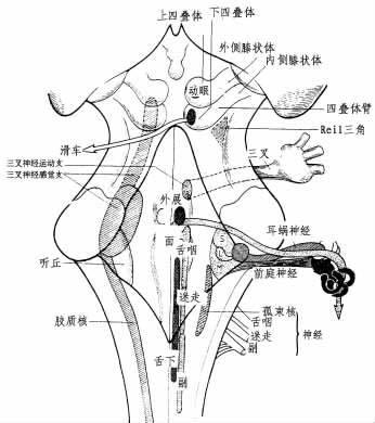 图11-11 耳蜗中枢束(径)(桥脑内段) 在耳蜗神经干交叉越过前庭神经纤维后分成内前和上二支,耳蜗纤维(脑桥神经元)至延髓-脑桥灰质。继续讨论关于耳蜗核群、耳蜗腹束、耳蜗背束、反射束。 1 .耳蜗核群属于两组 (1)腹核:呈顶在下方的锥体形,位于延髓和脑桥之间,在下小脑脚或绳状体上方的前外侧面后方和背核下方之间散开。在此腹核除外侧前庭核的两束纤维外(Hardy纤维来自球状囊并借入耳蜗神经),接受全部第八对脑神经的耳蜗神经纤维。自其上部发出耳蜗腹束或感觉束。 (2)背核:卵圆形,位于腹核的后方。在下小脑脚下方散开以达到第四脑室底外侧隐窝的后方。位于听结节凸起。仅接受来自腹核的纤维。 这些核群为双极细胞体。 2.耳蜗腹束或主要途径 此为到皮质的感觉束。为叙述方便,可分四部认识: (1)内延髓-脑桥部:此部集中在脑桥橄榄体处,取名为斜方体,其纤维在此与内侧丘系交叉,可分为(据C.Eyries):①同侧纤维,其一部丘系进入橄榄体,在此形成中转站;另一部直接升入外侧丘系。对侧纤维,多出2.5倍。此部大部分纤维中转于橄榄体。一小部分纤维直接进入对侧外侧丘系。②橄榄体间的纤维连接两橄榄体。 接近腹核,主要耳蜗束交叉及继续的前庭束,于此向后者发出一纤维束(Oort)。此束来自耳蜗并获得前庭神经的纤维。 (2)桥脑-丘脑部:组成外侧丘系。其由以前的同侧和对侧外侧耳蜗纤维组成。这些纤维进入内侧膝状体。 起源:起自延髓-脑桥区,在橄榄顶。①直接在小脑束的内方;②在内侧丘系的外方;③在脑神经核前方;④在脑桥神经核后方。 行程:上升斜向前外方,横过脑桥和脚的帽顶,由外侧之内侧丘系散开,同对侧外侧丘系交换纤维。 在脑桥区域内,位于:上小脑脚前方,斜向上内方到红核,由交叉小脑束将其分开。在黑质的后方,借运动束与所在的小脑脚相邻:在内侧丘系的外方。自行连结成一短路;在脚的外内侧是Reil三角区,界邻:①上边的下丘体臂;②前边的小脑脚外侧沟;③后方的上小脑脚隆起。横断面呈顶在外的三角形。 终止:内、外侧丘系相互分开,互相变成直角而止于下丘部;大部分纤维在下丘臂里随行到内侧膝状体。 内侧膝状体下叶的灰核群含有丘脑-皮质束的细胞体或第3神经元。 (3)丘脑-皮质束:形成听放射;横行穿过丘脑下部,在视放射前方获得内囊带状核下的部分止于颞叶皮质。 (4)听皮质区:此区投影在颞叶第一回的上部分、中脑沟的下缘(Heschl横颞灰质,Brodmann 41区)。 听识别区位于颞叶第一回的前区2/3(22区)。 24区是否邻接下后方之14区,尚有争议。这也影响到识别力。 每个耳蜗的皮质投影区都是优势交叉两侧性的。可确定对各种不同声音的相应皮质区(皮质耳蜗);高音与颞横回的内部相对应,低音与外部相对应。 每个耳蜗所产生的纤维均通向两侧皮质区,一侧听区破坏不会导致明显的耳聋。只有当两侧听区破坏时,才会引起全聋。 3 .耳蜗背束:这是一条直接连接耳蜗系统和网状结构的延髓途径,此“唤醒途径”阻碍腹感觉束。它似乎在立体音听觉中起着很重要的作用。 背核产生的纤维混入前边的下小脑脚和后方之第四脑室底之间以形成听纹(髓纹),然后纤维进入缝内以便加入网状结构。此束严格地保持着一侧性。 4.反射束:此束主要司听觉出发点的反射,可能司耳蜗相互作用反射。此束有3组中枢,在3个不同地方。 (1)上橄榄体:由脑桥橄榄、副橄榄、前橄榄核、斜方体核组成,位于延髓-脑桥区。 其传入纤维来自同侧及对侧的耳蜗腹核;传出纤维分布到脑干及其各传导束路。 脑干中有①面神经的两个核,说明镫骨肌反射是两侧性的;②下达脊髓的前角(借后侧纵束);③延髓-桥、眼-脑灰质核;④网状结构中;⑤脑神经植物核中;⑥对侧橄榄体中。 除脑干外,在耳蜗:神经纤维束直接传出耳蜗-橄榄束和Pasmussen交叉束。 (2)丘系核:连接桥脑脚的丘系。其传入纤维来自外侧丘系,传出纤维分布到同侧内侧膝状体的上部和对侧下丘系。 (3)下丘系核群:由主要核、中枢核及其接受外丘系的大量纤维和内-背核组成。其传入纤维来自同侧外丘系和对侧丘系和对侧丘系核,其传出纤维分布到:①对侧下丘:听神经间的Gudden连合。②上丘(听-视束)。③脑神经核及髓质中:桥脑-皮质束、盖-延髓束以及盖-脊髓束。 同侧中脑,特别是肌张力反射的源泉。 二、前庭束及前庭中枢(图11-12,11-13)