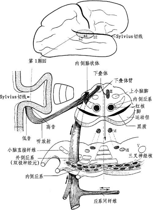 图11-12 耳蜗中枢束(径):脑桥、丘脑及丘脑皮质段