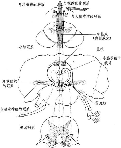 图11-15 前庭神经束的总观 前庭双极神经元与感觉性传入纤维存在多发性连接,而且动眼神经可参加控制和调节躯干、颈、四肢以及眼部反射运动的平衡。 1 .脊髓的连接:这里要借止于脊髓前角中之两股纤维束来实现。可控制躯干、四肢以及颈部的肌肉。 (1)前庭-脊髓侧束:侧前庭核生自唯一的同侧纤维,重新发出到脊髓各段;其对伸肌有兴奋作用,而对屈肌则有抑制作用。 (2)束内前庭-脊髓束:来自内前庭核,两侧分布;特别行向颈部脊髓和胸部脊髓高处以供背部和肌肉的运动神经元。 2.小脑连接:这里包括传入和传出途径,与小脑弓(绒球-结节叶)有重要关系。 (1)前庭-小脑连接:有两种: 直接的:由前庭升支产生的纤维组成。后者接受小脑下脚并加入盖核。 间接的:此等纤维在其到达盖核前连接降前庭核群。 (2)小脑-前庭连接:产生于小脑弓皮质并加入前庭核群,借2条途径:①同侧的直接途径;②间接途径,重新连接盖核之后并加入两侧的前庭核。 在小脑和前庭核之间有一条本体及定向非常准确的密切连接小脑和前庭核的双重通道。 3 .与动眼核群的连接:内侧纵束(后纵束)保证其直接连接。其组成一很广泛的联合束,自上方的后白连合到下方的颈髓。 前庭核与动眼核的连接是直接由前庭-中脑束(内侧纵束)来保障和交叉的。分布到:①动眼核群;②位于两脑邻近的Darkschwitsch和Cajal束连接。 系统化: 上前庭核(前庭神经上核)仅分布到同侧动眼神经核且主要管理垂直和旋转功能。 正中核(前庭神经内侧核),为两侧性的,对称分布,管理水平运动。 降前庭核(前庭神经脊核)和侧前庭核(前庭神经外侧核),仅起微小的动眼作用,间接连接属多发神经元的连接。此连接避开内侧纵束并有小脑和网状结构连接。 4.与网状结构的连接:直接借网状结构连接侧前庭核而可影响中枢核的结构。 此网状结构在眼球震颤中起重要作用。 另外,网状结构保证着同交感核、迷核、孤立束核的连接,以阐明出现眩晕的植物神经症状。 5 .与脑皮质的联合:前庭皮质束的存在似难争辩,然而其后的途径尚不十分清楚。此前庭-皮质束只接受同一途径的中枢耳蜗束途径;还有一途径到后侧纵束和视丘。 投影在本体冲动的相等集中点内。 注意:必须阻止耳蜗途径的功能,因它可把声的印象传到大脑皮质,而在前庭途径显然是在皮质下区。 应把前庭系统看成是本体感受器的不同成分之一。 中枢耳蜗束,仅代表极其复杂结构的一个图案,在某些动物身上比人的了解更清楚些。中枢及其多发性神经元并非是简单地反射传达器,而是转变反射。不存在皮质“发射装置”,声音的感受是多发兴奋冲动到达的结果。 与其他感官不同,前庭与丘脑接触极少。 |