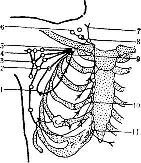 图8-1 乳腺癌播散三条主要途径 (腋下、内乳、锁骨上) 1.胸肌后路 2.胸肌内淋巴结 3.中心组淋巴结 4.腋静脉组淋巴结 5.锁骨下淋巴结 6.锁骨上淋巴结 7.内颈路 8.下颈深淋巴结 9.胸肌间路 10.内乳路 11.心包前淋巴结 10%~15%乳腺癌病人就诊时已有潜在的远处转移。术前腋淋巴结转移的病人经全身骨扫描证实20%的病人已有骨转移。尸体解剖表明,远处转移常见的部位是肺(60%~80%),肝脏(50%~60%),骨(50%)等。 |