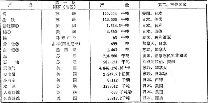 注:①苏联产量数字不详。 ②为1978年产量。 资料来源:联合国《统计年鉴》1978年;联合国《统计月报》1980年4月、7月、8月,1981年1月,联合国《工业统计年鉴》1978年。 |