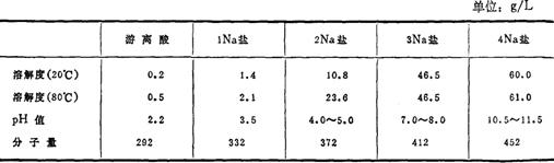性能 白色、无味、无嗅的结晶性粉末,240℃分解。微溶于水,不溶于普通有机溶剂,能溶于5%以上的无机酸。用苛性碱中和,可生成1、2、3、4碱金属盐。它们在水中的溶解度见下表。